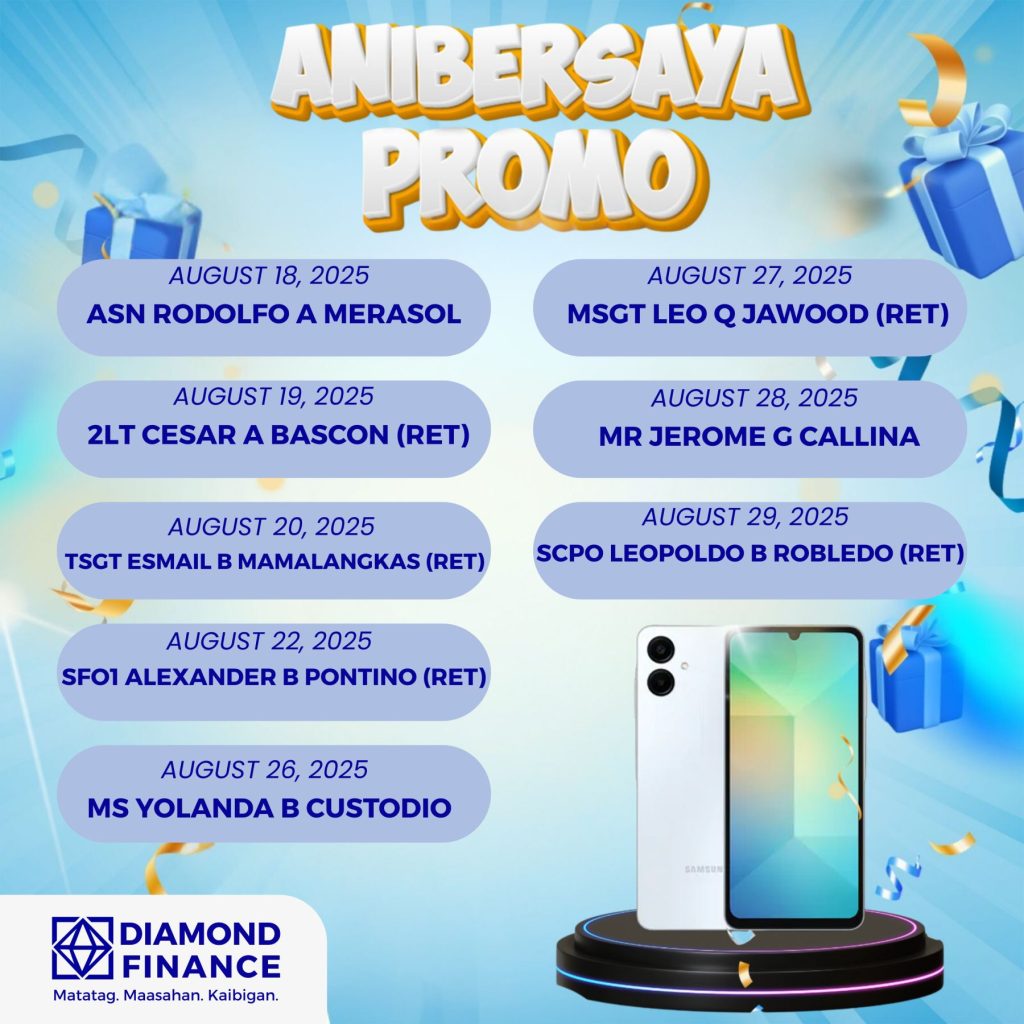 Magandang Araw mga Kaibigan! Narito ang mga maswereteng nanalo ng bagong Smartphone hatid ng ating Anibersaya Promo! AUGUST 18, 2025 – ASN RODOLFO A MERASOL AUGUST 19, 2025 – 2LT CESAR A BASCON (RET) AUGUST 20, 2025 – TSGT ESMAIL B MAMALANGKAS (RET) AUGUST 22, 2025 – SFO1 ALEXANDER B PONTINO (RET) AUGUST 26, 2025 […]