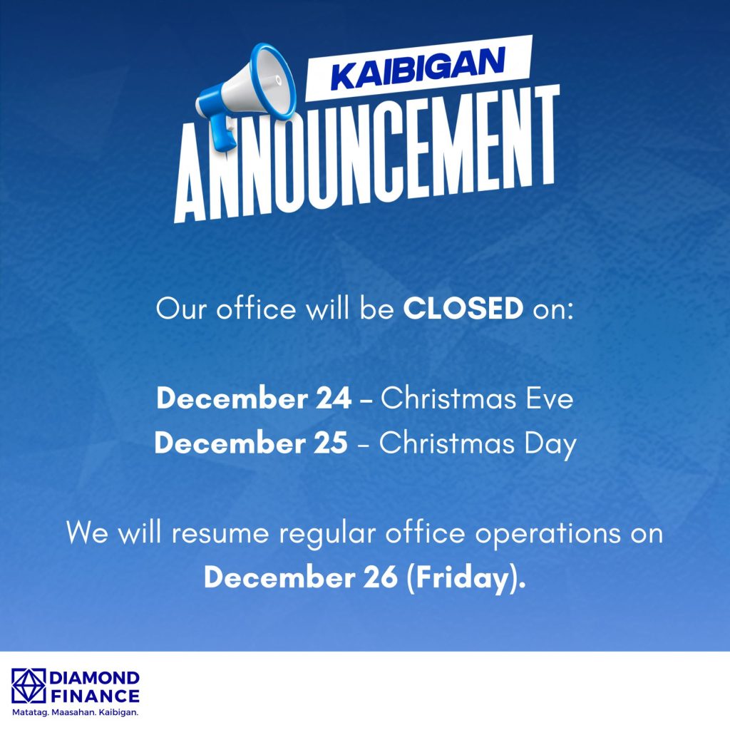 KAIBIGAN ANNOUNCEMENT! Our office will be CLOSED on: December 24, 2024 – Christmas Eve December 25, 2024 – Christmas Day Regular office operations will resume on December 26 (Friday). #MATATAG #MAAASAHAN #KAIBIGAN