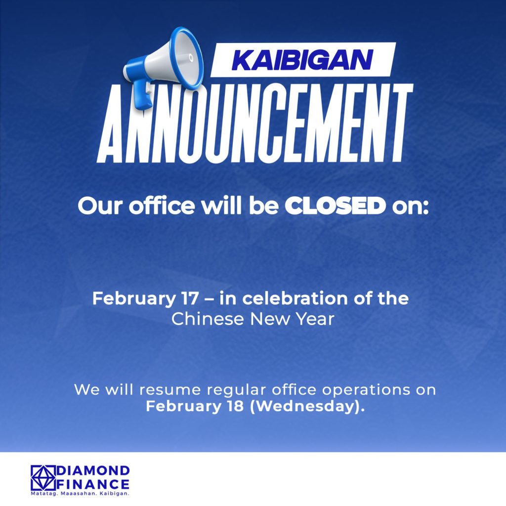 Magandang Umaga mga Kaibigan! Sa kabila ng nagbabadyang masungit na panahon at suspensyon ng pasok sa tanggapan ng gobyerno, mananatiling bukas ang aming opisina para magbigay ng serbisyo para sa inyo mga Kaibigan! Para sa mga katanungan at loan verification, maaari ninyo kaming bigyan ng mensahe sa aming opisyal na Facebook Account na Diamond Cubao, […]