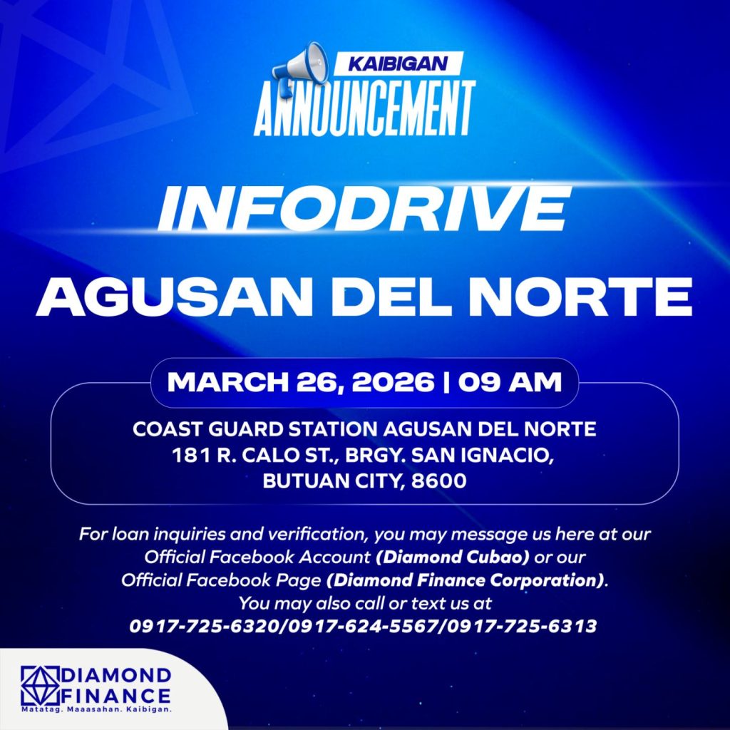 KAIBIGAN ANNOUNCEMENT: Para sa mga Kaibigan natin sa Agusan Del Norte, ang Diamond Finance, kasama ang PCG HRMU Coast Guard Station Agusan del Norte ay magsasagawa ng INFODRIVE. Narito ang mga detalye: March 26, 2026 @ 9:00 AM Coast Guard Station Agusan del Norte 181 R. Calo St., Brgy. San Ignacio, Butuan City, Agusan del […]