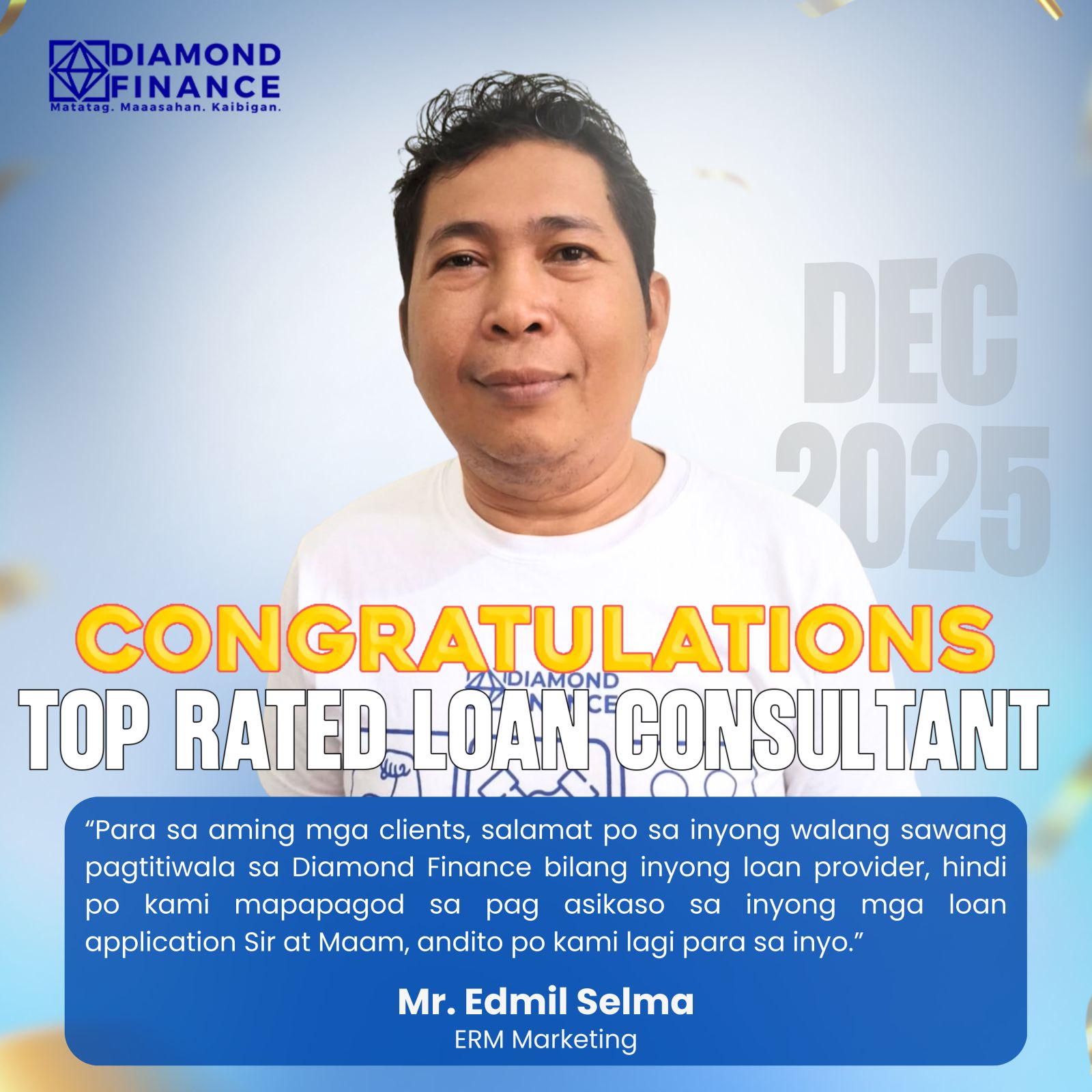 Mr. Edmil is a sub-loan consultant of ERM Marketing. He got to know about Diamond through his wife, who is also a sub-loan consultant of the said marketing. He started with the company in 2020 and was assigned in Cagayan De Oro city. He answers inquiries and concerns about loans and ensures smooth and fast processing for his clients through constant communication in the office. Mr. Edmil is our Top Rated Loan Consultant for December 2025.